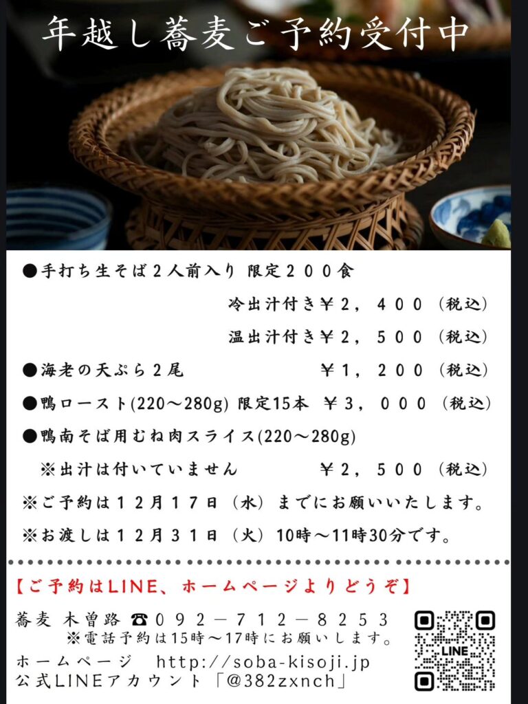 蕎麦 木曽路 の味をご自宅でお楽しみ頂ける、年越し蕎麦のご予約を承ります。